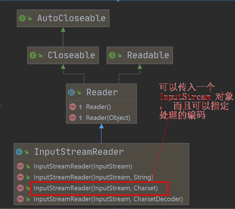 - 传入字节流,然后变成字符流,完成字节流到字符流的转换